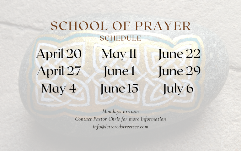 Most Mondays through the school year, at 10am Pastor Chris hosts a School of Prayer gathering for anyone interested in learning to pray.